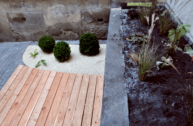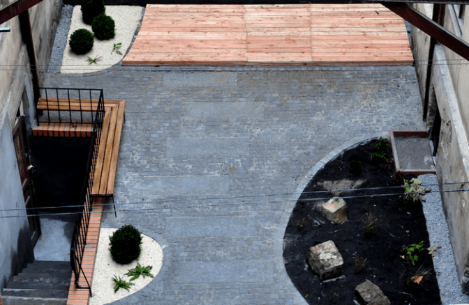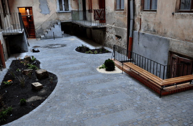 Зараз тут відновили торцеву стіну, зробили чітке планування, нове мощення та ділянки, де мешканці вирощуватимуть квіти. Також тут облаштували клумбу на підвищенні уздовж брандмауера, дві лавочки та дерев’яну терасу.