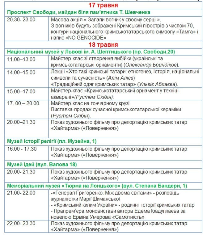 Частина кримських татар знайшла притулок у Львові. Відтак, кримськотатарська громада міста Львова розробила план подій та запрошує львів’ян разом вшанувати пам'ять про цю трагічну сторінку в історії народу.