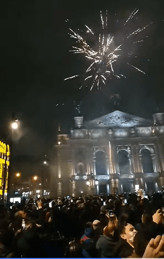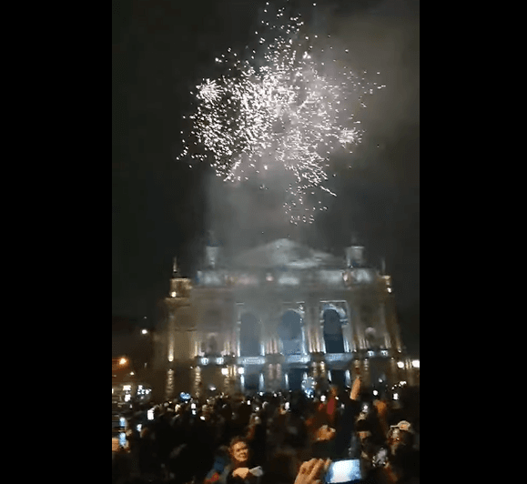 У Львові сьогодні, 1 січня, коли містяни зустрічали новий рік, у центрі міста біля головної ялинки запускали салюти попри заборону. Також площа була заповнена людьми попри карантинні обмеження.