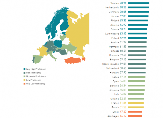 Данія поступилася Швеції та Нідерландам першим місцем за рівнем володіння англійською. У топ-10 також опинилися Норвегія, Фінляндія, Словенія, Естонія, Люксембург, Польща та Австрія. Серед країн ЄС найнижчий рівень англійської – у громадян Франції, яка опинилася на 37 місці (минулого року країна була 29-ю).