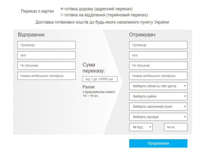 Вартість переказу при виборі опції готівка на відділення (терміновий переказ) становить: 1% від суми переказу + 5 грн (мінімум 10 грн).
