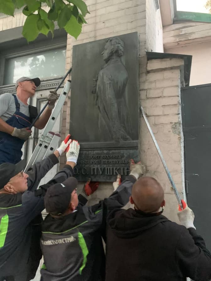 На вулиці Грушевського 14 в Києві зняли меморіальну дошку, яка вказує, що в цьому будинку у 1821 році нібито перебував російський поет Алєксандр Пушкін. Про це повідомила депутатка Ксенія Семенова.