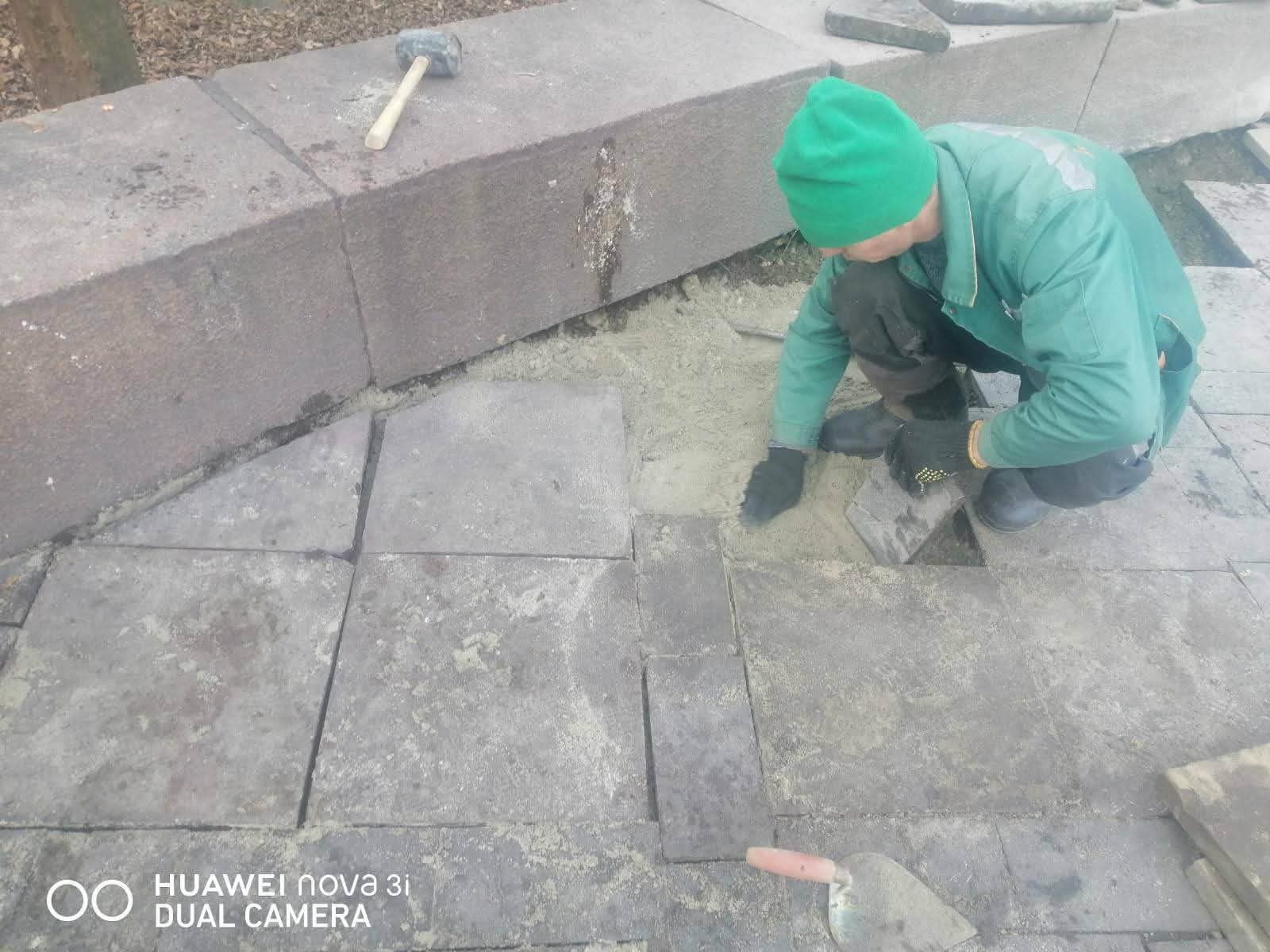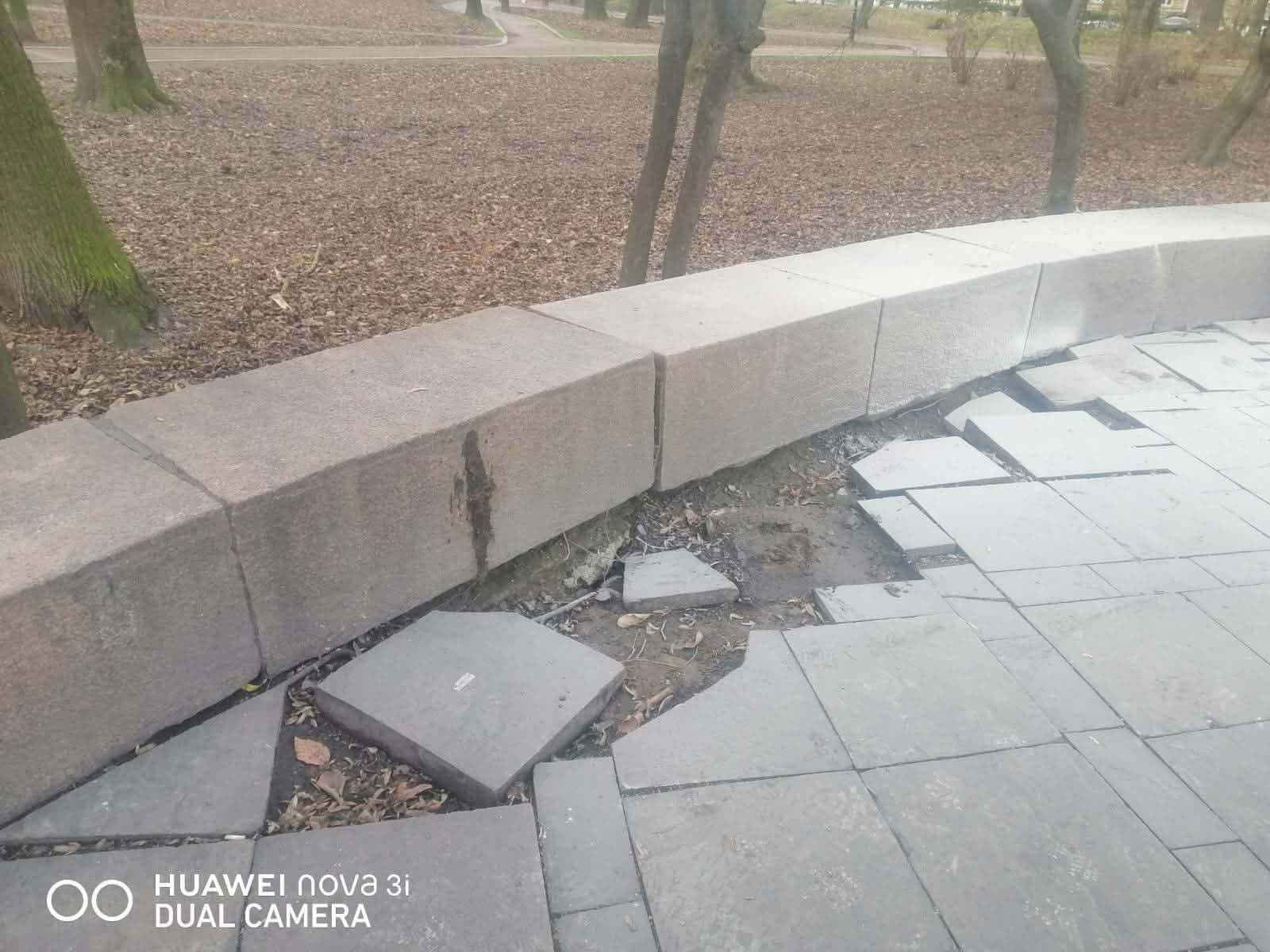 У парку ім. Івана Франка лагодять пошкоджений тротуар, вирівнюють бордюри і змивають залишені вандалами написи. Про це повідомили на Facebook-сторінці «Львів.Містобудування».