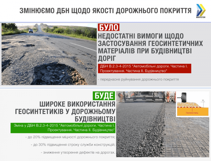 Йдеться про геотекстиль, геосинтетичні гратки і сітки, геомембрани, геокомпозити тощо. За словами Лева Парцхаладзе, це дозволить до 20% зміцнити дорожнє покриття, до 30% підвищити термін його служби та зменшити утворення можливих дефектів на дорогах.