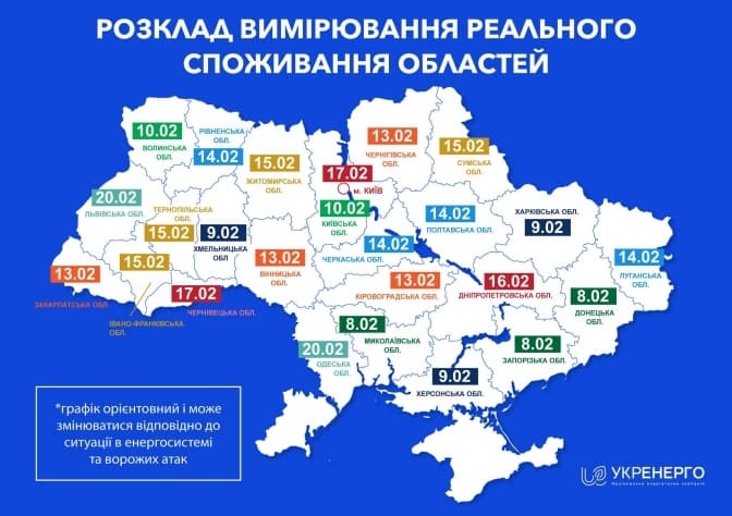 У кожній області почергово на один день повністю будуть зняті обмеження споживання. Оскільки в енергосистемі дефіцит потужності, спричинений російськими атаками, одночасно в областях, де не проводяться виміри в конкретний день, ліміти споживання можуть бути дещо знижені. Це необхідно для того, щоб були проведені вимірювання фактичного споживання в кожній області. Про це повідомили в Укренерго.