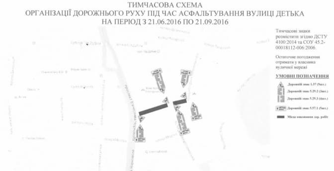 На місці проведення робіт будуть встановлені відповідні дорожні знаки, інформаційні панно та щити загородження.