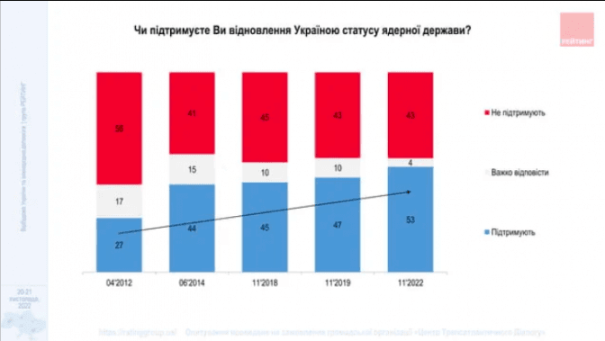 В Україні зросла кількість тих, хто підтримує відновлення країною статусу ядерної держави. Так, у 2019 році таких було 47% – у 2019 році, а у 2022-му – 53%. Про це свідчать результати дослідження, що проводила соціологічна група «Рейтинг» 20-21 листопада цього року.