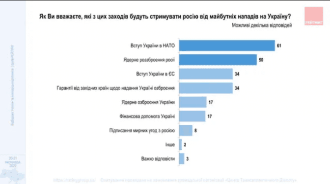 Окрім цього, вступ України в НАТО (61%) та ядерне роззброєння росії (50%) – це заходи стримування майбутніх нападів на Україну, що найчастіше підтримують респонденти. Вступ України в ЄС та гарантії від західних партнерів щодо надання озброєння Україні як методи стримування підтримують по 34% опитаних. Ядерне озброєння України та фінансову допомогу нашій державі обрали по 17%. За підписання мирних угод з росією як метод стримування агресії – лише 8%.