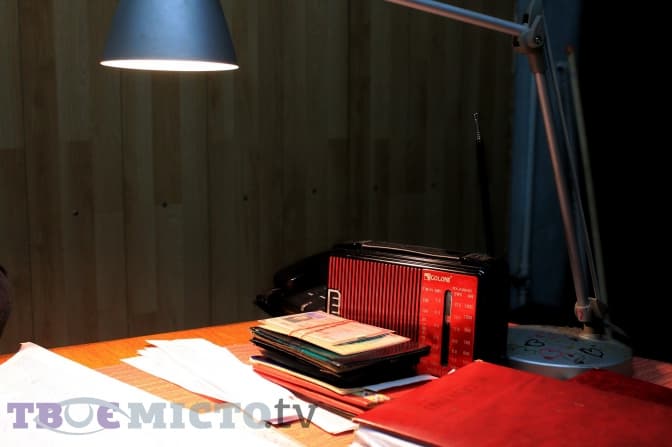 На столі в господині бюро маленький радіоприймач. Лампа світить на журнал із записами про знайдені й повернені речі. На стіні висять зв’язки ключів.