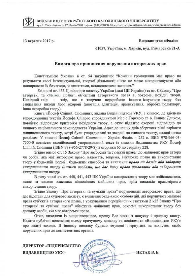 Мова йде про книгу «Йосиф Сліпий. Спомини», яку цього року на Форум видавців привезло «Фоліо». Книгу з такою ж назвою видав УКУ кілька років тому. В офіційному зверненні до харківського видавництва зазначається, що скопійовано було текст із сторінки 65 по сторінку 228.