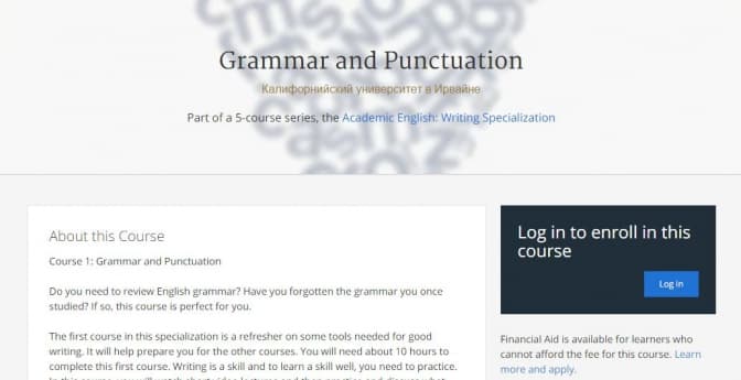 Grammar and Punctuation - курс з граматики та пунктуації, який розміщеній на онлайн-платформі coursera. Дозволить оволодіти основними часами в англійській мові та правильно розставляти розділові знаки. Ідеальний для тих, хто хоче навчатись за кордоном, виконує письмові роботи або веде листування англійською.