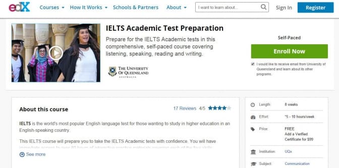 IELTS academic test preparation – використовуючи платформу EdX можна ознайомитись з курсом для тих, хто хоче здати IELTS. Понад 80 годин інтерактивних завдань аналогічних тестовим. Зареєструвавшись ви також дізнаєтесь про основні стратегії виконання кожного з видів завдань завдяки мультимедійним презентаціям.