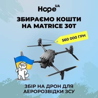 Благодійний фонд «Hope.ua» збирає кошти на дрон MATRICE 30T. За допомогою цього дрону коригується робота артилерії і спалюється техніка ворога. MATRICE 30T запезпечує максимальну безпеку для того, хто ним керує, оскільки можна перебувати близько до тилу та не наражатися на небезпеку. Максимальний час польоту дрону – 41 хв, а швидкість – 23 м/с. Безпілотник може працювати у найсуворіших умовах та піднімається на висоту до 7 000 м над рівнем моря. Важливо, що дрон має-200 кратний зум та може стати очима для наших військових.