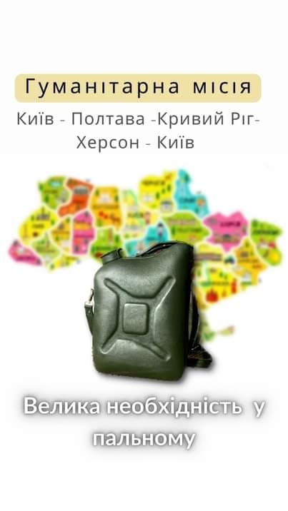 Благодійний фонд «Вільна ватра» оголосив збір на пальне для заправки машин, які вирушать за маршрутом Київ – Полтава – Кривий Ріг – Херсон – Київ. Завдяки попереднім зборам машини завантажать допомогою для мирного населення, що постраждало від окупантів, та військових ЗСУ.