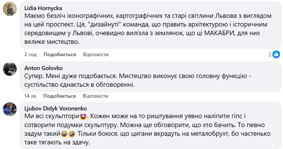 Під дописом з'явились різні коментарі як на підтримку, так і проти цієї скульптури. Дехто вважає, що аби розуміти її, то треба знатися у мистецтві. Також пояснюють це тим, що це складна візуальна метафора, і вартує, аби сам митець її пояснив.