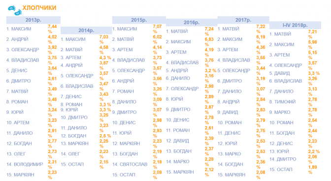 До 15 найпопулярніших хлопчачих імен увійшли: Матвій, Максим, Артем, Олександр, Давид, Владислав, Данило, Тимофій, Марко, Роман, Богдан, Денис, Юрій, Дмитро, Остап.