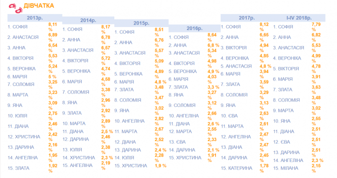 Дівчаток найчастіше називали так: Софія, Анна, Анастасія, Вероніка, Вікторія, Марія, Злата, Соломія, Марта, Яна, Діана, Єва, Дарина, Ангеліна, Мілана.