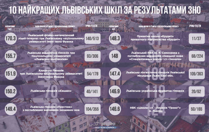 Додамо, що цього року у Львові зовнішнє незалежне оцінювання складали 4334 учні. Серед навчальних закладів із найнижчими показниками балів ЗНО опинилися Львівське вище професійне політехнічне училище, Міжрегіональне вище професійне училище автомобільного транспорту та будівництва, Львівська ЗОШ №71 та школа-інтернат №2. Повний рейтинг усіх шкіл Львова можна переглянути за посиланням.