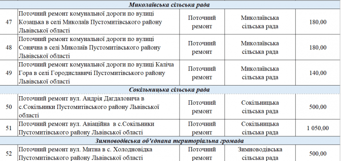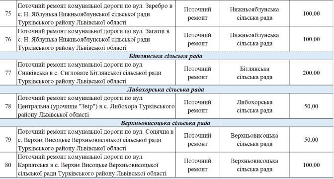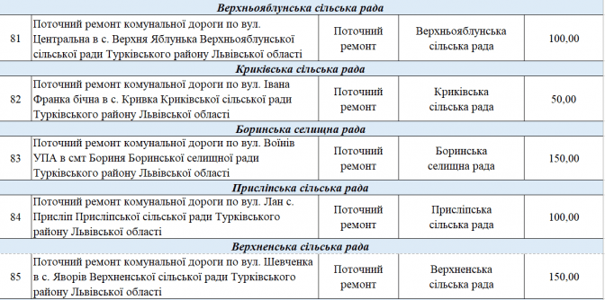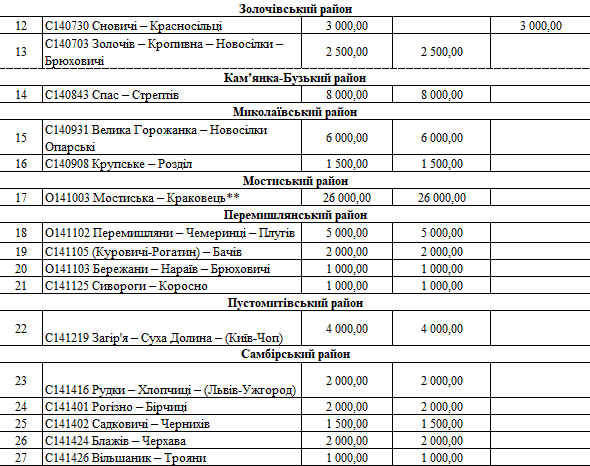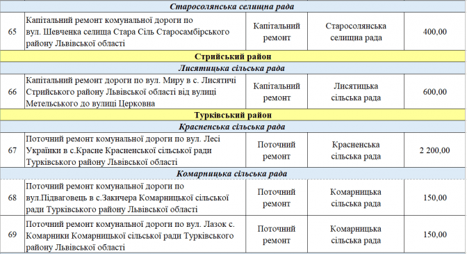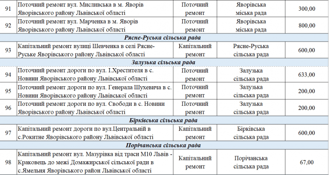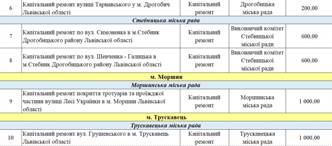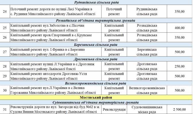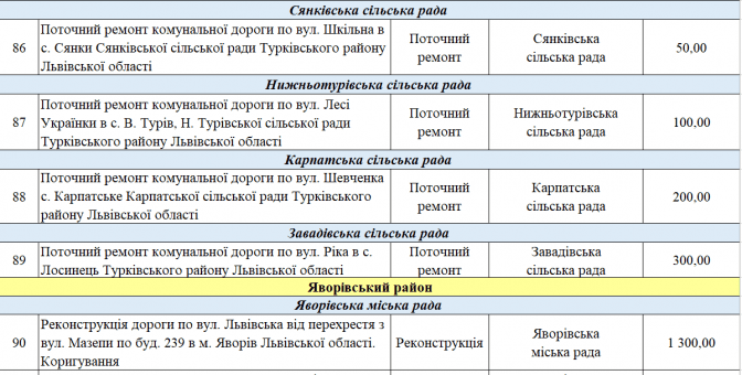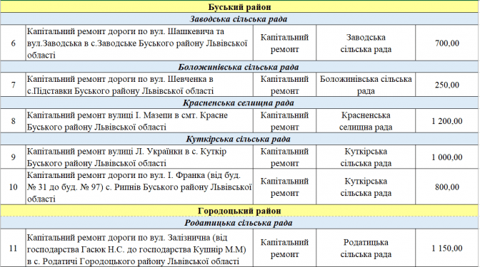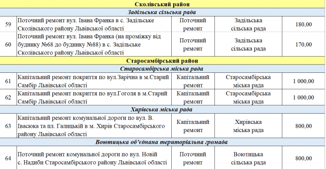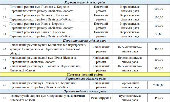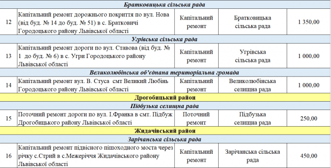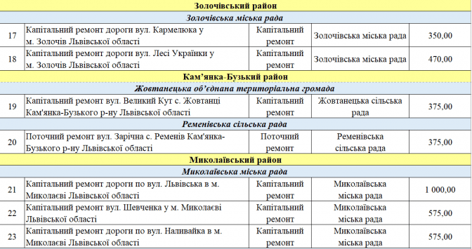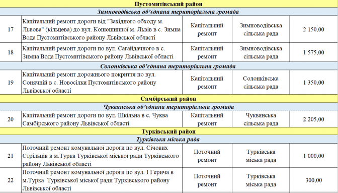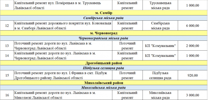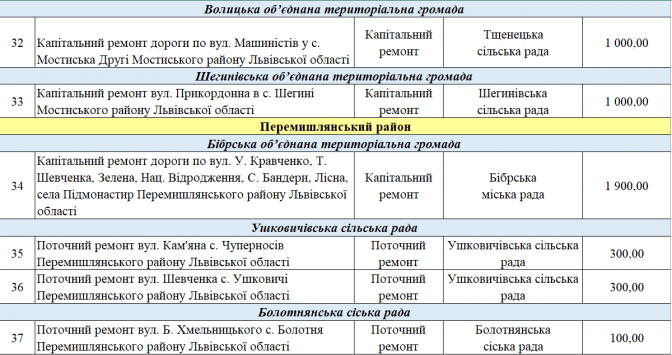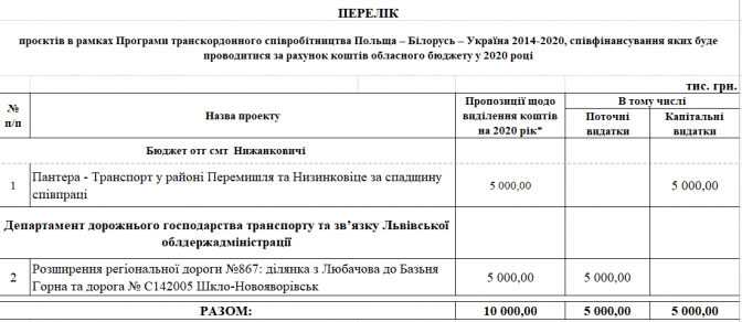 У переліку є два проєкти із Програми транскордонного співробітництва Польща – Білорусь – Україна 2014-2020. Це «Пантера - Транспорт у районі Перемишля та Низинковіце за спадщину співпраці» (5 млн грн) та розширення двох доріг з Любачова до Базьня Горна та Шкло-Новояворівськ (також 5 млн грн).
