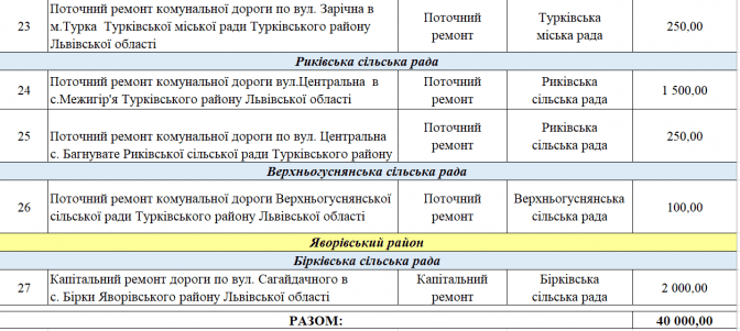 Зокрема, 53 млн грн пропонують виділити на дороги комунальної власності, на дороги загального користування майже 47 млн грн, на дороги державного значення – 1,5 млн грн та місцевого – 171 млн грн. Ще 40 млн грн планують виділити із резервного фонду обласного бюджету.