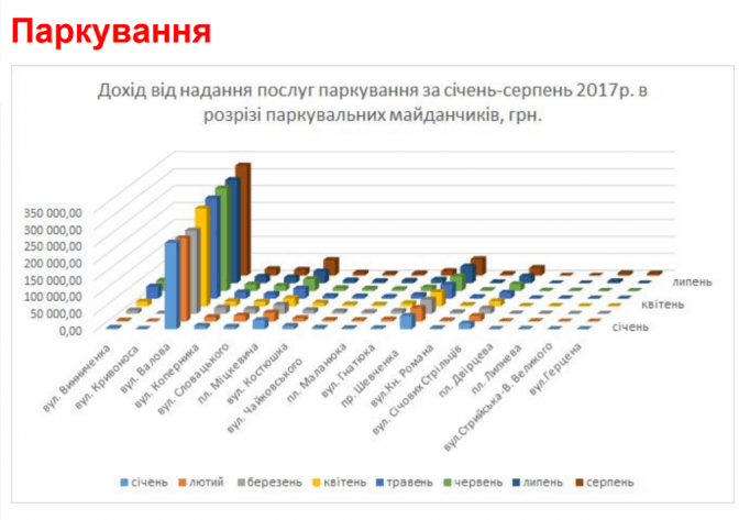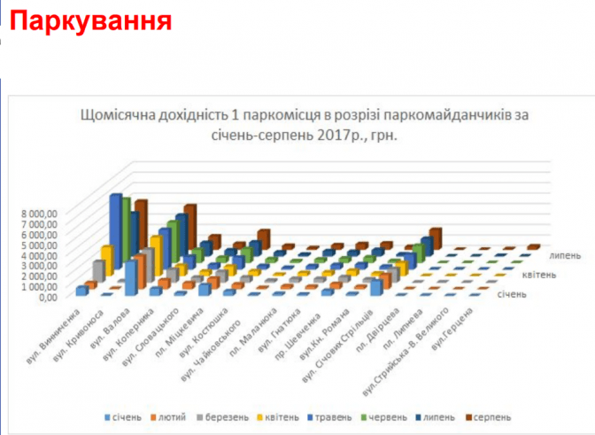 - 17 відведених майданчиків у 1-й зоні паркування (391 паркомісце) – 6 грн/год