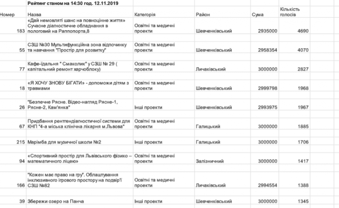 До завершення голосування за проєкти Громадського бюджету Львова залишилося три дні. На сторінці Громадського бюджету опублікували попередній рейтинг проєктів станом на вечір 12 листопада.