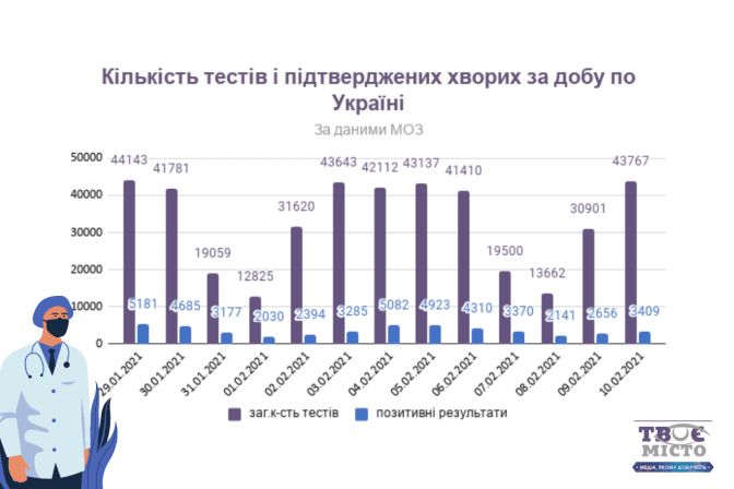 В Україні за добу підтвердили 3 409 нових випадків коронавірусної хвороби. У стаціонари госпіталізували 2 046 людей, померли від ускладнень 163 пацієнти, а одужали 7 768 українців. За добу в країні провели 43 767 тестувань.