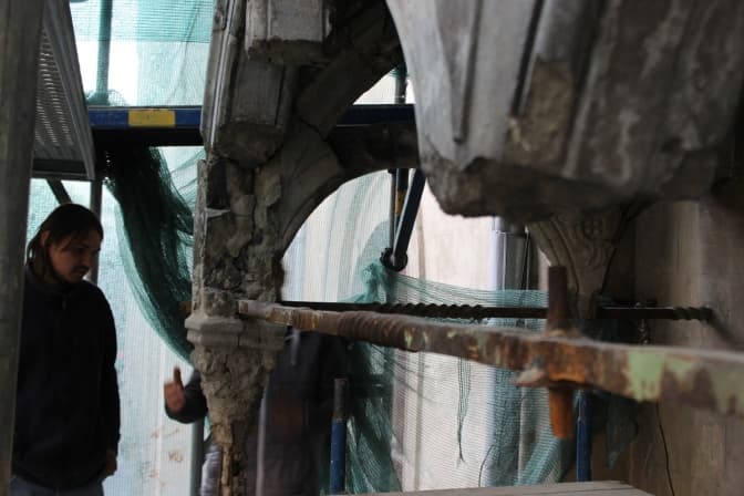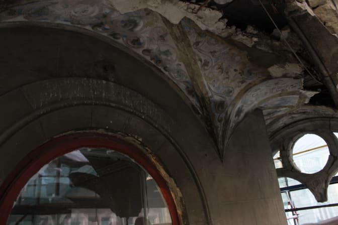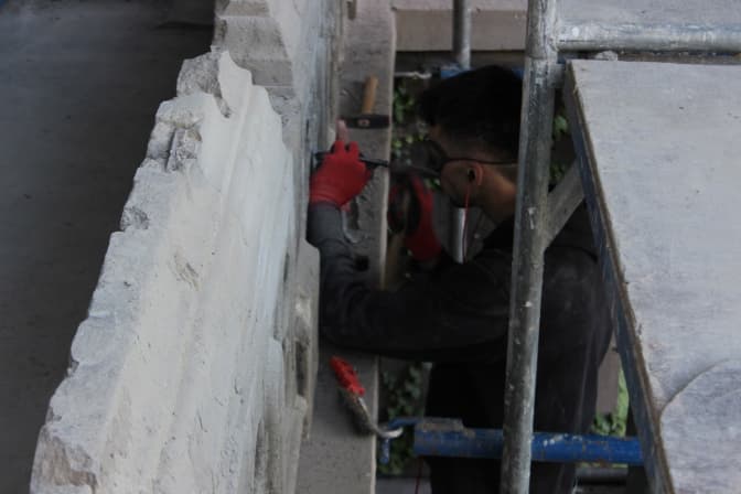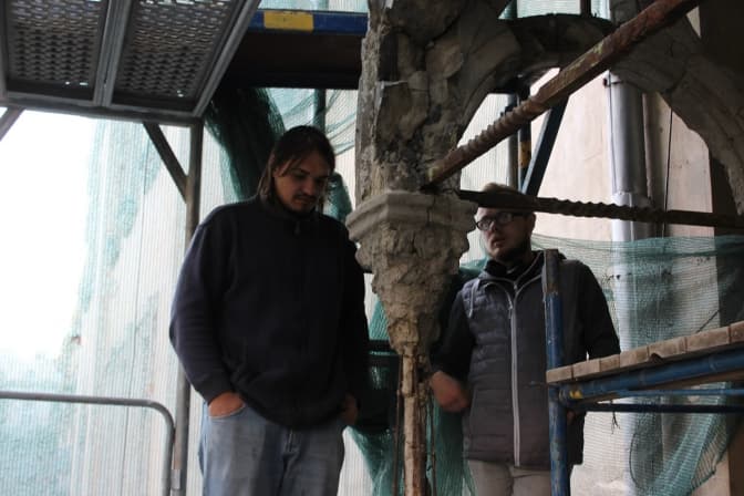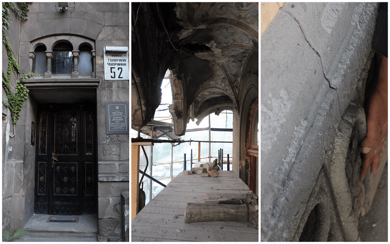«На момент реставрації більшість колон була вже зруйнована, – розповів керівник реставраторів Андрій Федоришин. – Можна було пробувати їх склеїти, але через те, що тут постійні вібрації від трамваїв, є небезпека, що шматки фасаду відпадуть і нароблять шкоди. Ті елементи, які зараз несуть загрозу, відливають у майстерні й замінять на нові». Також ковалі відновлюють металеві елементи.