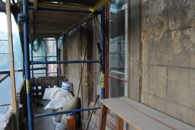 Стіни будинку спершу були гладкими, але пізніше їх вкрили цементом. Із часом це покриття розтріскалось, тріщини від вібрації розширювались, і будинок руйнувався. Зараз команда реставраторів відновлює стіни й колони.