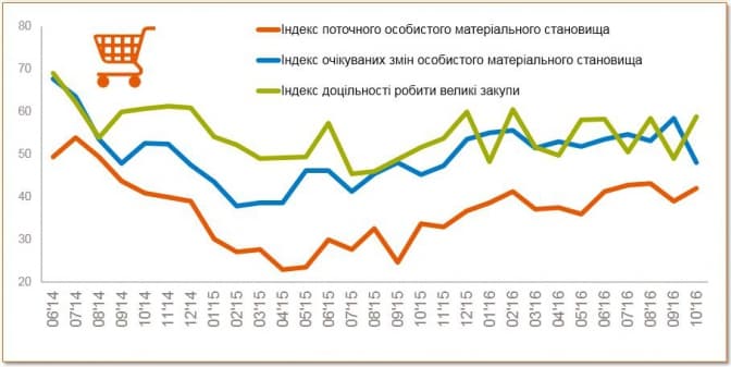 Згідно з результатами дослідження, середнє значення індексу за січень-жовтень 2016 року на 6 пунктів вище, ніж за відповідний період минулого року. Швидшими темпами зростає індекс оцінки особистих доходів. Українці демонструють нестабільність у рішеннях, чи робити великі закупи.