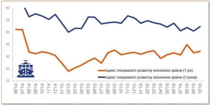 Також результати дослідження свідчать, що громадяни втрачають довіру до економічної політики, що стримує зростання споживчих настроїв. Адже середнє значення індексу розвитку економіки на 5 років зменшилось на 2 пункти у січні-жовтні 2016 року до січня-жовтня 2015 року.