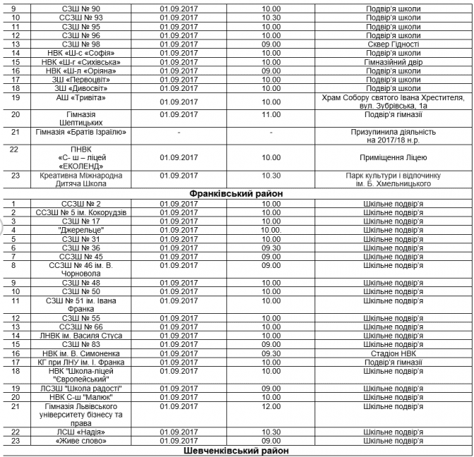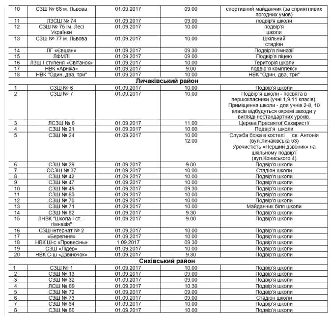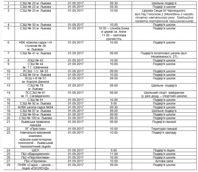 Більшість шкіл Львова проведуть Свято першого дзвоника на шкільних подвір’ях. Частина шкіл перенесе лінійку на спортивні майданчики, а декілька навчальних закладів проведуть перший дзвоник у церквах, що поблизу шкіл, повідомляє прес-служба ЛМР.
