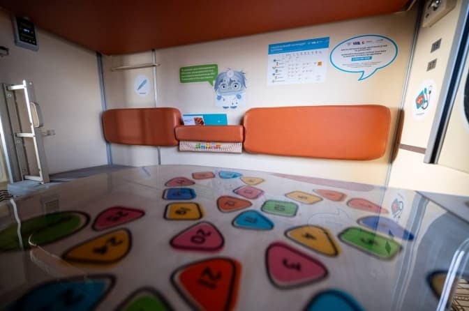 Зокрема, кожне купе облаштували навчально-розважальними матеріалами, настільними іграми, манежами для малечі та збільшеними обмежувачами верхньої полички із протиударною накладкою. А в коридорах розмістили інтерактивні плакати, бізі-борди з рухомими елементами і дитячі поручні з мʼякою оббивкою для безпечного пересування.