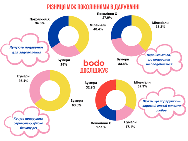 І це не дивно, адже навіть всередині одного покоління різні люди оперують власними поглядами, які відповідно можуть не мати нічого спільного між собою навіть щодо таких приємних речей, як-от подарунки. Уявлення, звички та ритуали дарування формуються в індивіда залежно від багатьох чинників: культура, соціально-економічний статус, стать, етнічна належність і вже згадане покоління. Такі відмінності стали предметом зацікавлення і для дослідників, і для бізнесів. Подарунки можуть об'єднувати людей, а можуть чітко окреслювати відмінності між ними. Компанія bodo дослідила як люди з усіх верств суспільства й вікових груп можуть легко отримати незабутні враження та емоції в подарунок.