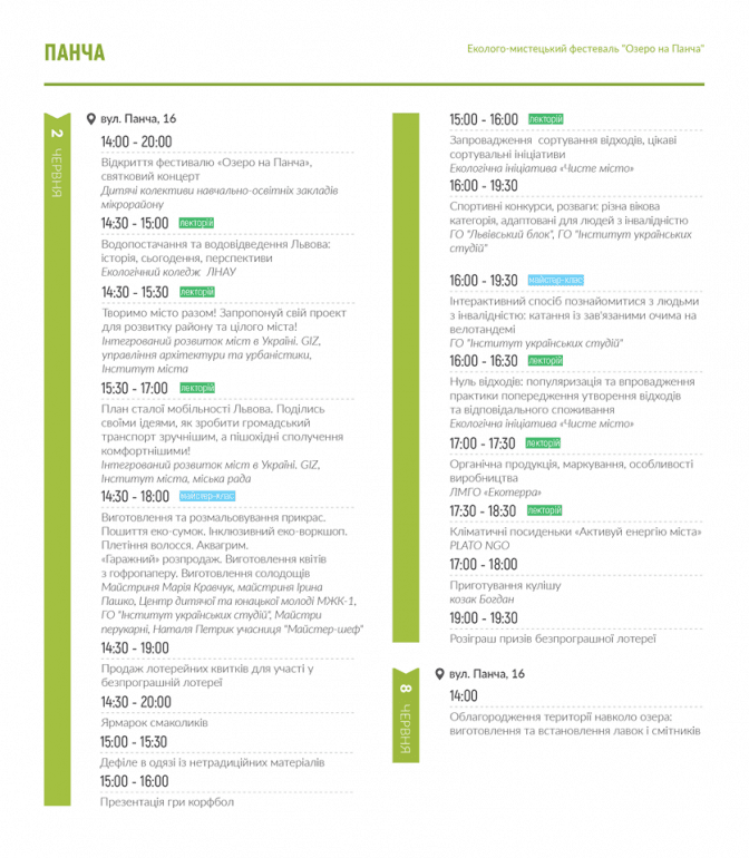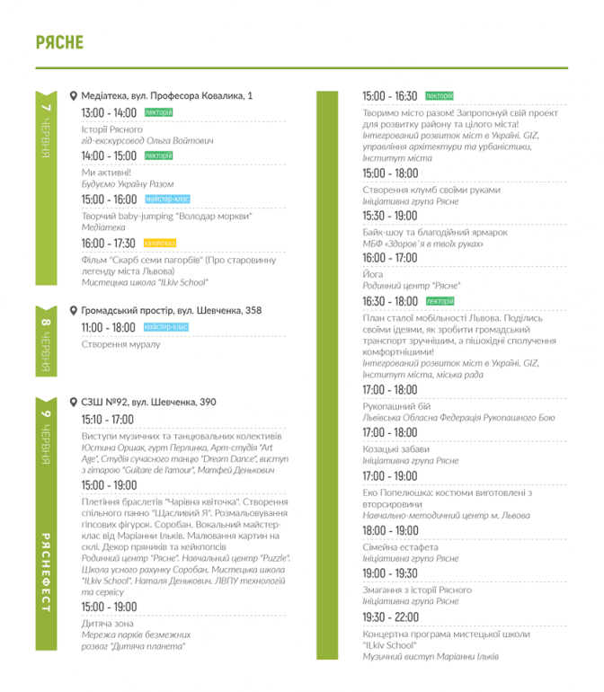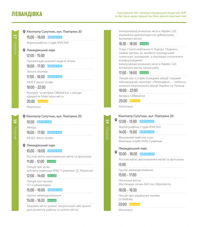 Відкриття майстерні відбудеться на локації ГО «Нові орбіти» біля молодіжного центру «Супутник». Заходи Майстерні на Левандівці триватимуть до неділі 19 травня. Заходи на Підзамчі відбуватимуться на заводі РЕМА, біля озера Панча та в Рясному.