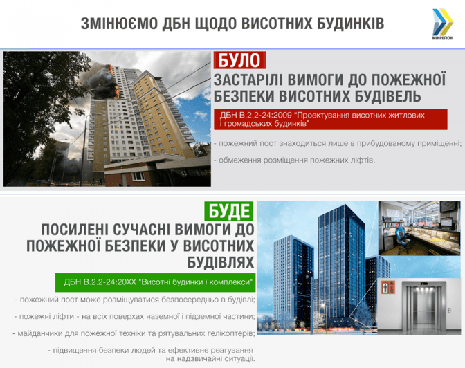 У чинному ДБН щодо висотних будинків вказано, що пожежний пост або центральний пункт управління будівлею має розміщуватися в окремому приміщенні, прибудованому до зовнішньої стіни багатоповерхівки. За новими нормами його дозволили розміщувати безпосередньо у самій будівлі, що дозволить швидше реагувати на можливі надзвичайні ситуації.