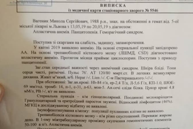 Миколі Вагенику необхідна пересадка кісткового мозку, вартість якої становить 100 тис. доларів. У Миколи виявили апластичну анемію.