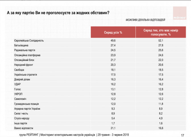 Водночас антирейтинг партій очолює «Європейська Солідарність», за яку за жодних обставин не голосуватиме 52% виборців.