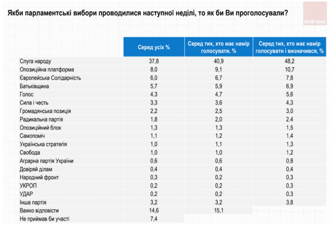 Найбільше українців, які визначилися і будуть голосувати, готові підтримати «Слугу народу» – 48,2%, ще 10,7% голосуватимуть за партію «Опозиційна платформа – За життя», а 7,8% – за «Європейську Солідарність». Також подолати 5-відсотковий бар’єр може «Батьківщина» (6,9%) та партія «Голос» (5,6%). Додамо, що рейтинг партії «Слуга народу» почав динамічно зростати у останні три місяці.