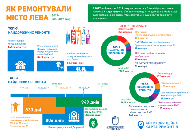 Відповідно до даних на карті, з початку 2017 року у Львові уклали понад 3 тис. договорів на проведення ремонтних робіт і витратили близько 3 млрд грн. Найбільше коштів витратили на сферу ЖКГ, капітальне будівництво та роботи водоканалу. Наприклад, найдорожчими були реконструкції пл. Двірцевої – 165,5 млн грн, вул. Замарстинівської – 84,5 млн грн та ремонт парку «Скнилівський» – 43,9 млн грн. А найдовшими – ремонти парку-пам’ятки «Залізна вода» (949 днів), спортивного майданчика СЗШ №27 на вул. Свєнціцького, 15 (833 дні) та пл. Двірцевої (806 днів).