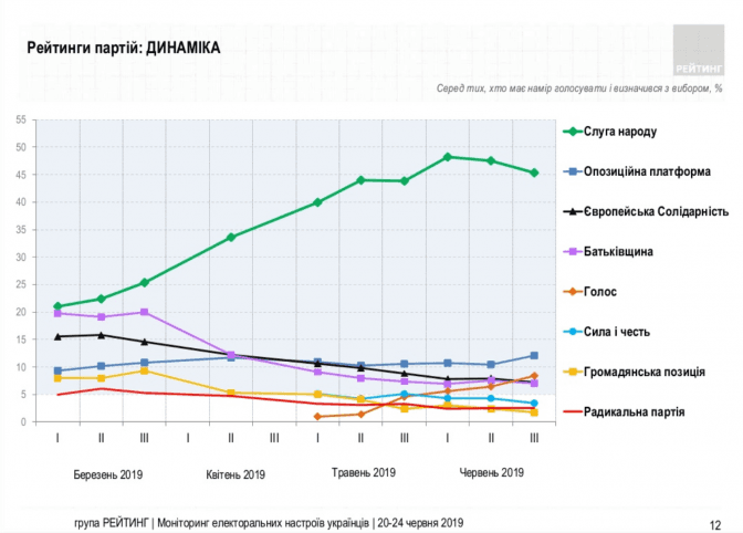Найбільше у останні пів року зріс рейтиг «Слуги народу», особливо у травні, втім у червні поступово почав спадати, та «Голосу». Рейтинг партії «Опозиційна платформа – За життя» тримається на одному рівні, а рейтинг «Європейської Солідарності» та «Батьківщини» спадає з березня.