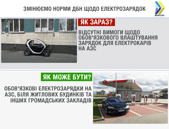 Із 1 липня в Україні запрацювали зміни до будівельних норм, за якими реконструйовані та нові парковки повинні мати 5% паркомісць для електрокарів. Крім цього, за паркування автомобілів на бензиновому двигуні на парковках, які мають доступ до зарядок для електромобілів, будуть штрафувати.