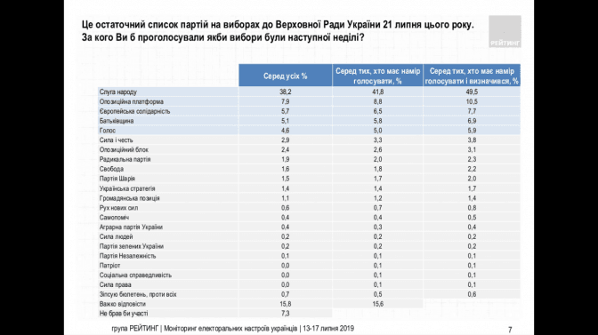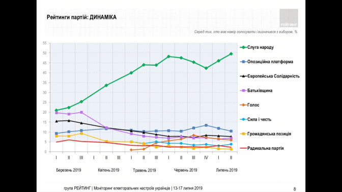 Згідно з результатами соціологічного опитування, проведеного групою «Рейтинг», лідером електоральних симпатій українців залишається партія «Слуга народу», що має підтримку 49,5% виборців, які мають намір голосувати.