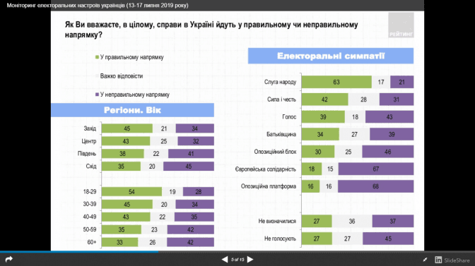 41% респондентів вважають, що справи в Україні йдуть у правильному напрямку, 37% – у неправильному, 22% – не визначилися з цього питання. Найкраще оцінюють напрямок розвитку країни на Заході та у Центрі, відносно гірше – на Сході. Більш оптимістичною залишається молодь та виборці «Слуги народу». Натомість найбільш песимістичними є симпатики партій «Європейська Солідарність» та «Опозиційна платформа – За життя».