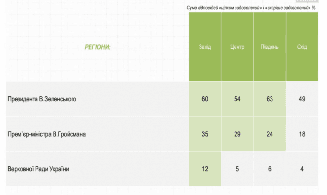 Так, діяльністю Володимира Зеленського задоволені 58% опитаних, 19% – не задоволені, ще 24% наразі не можуть сформувати своє ставлення до нього. Позитивно оцінюють діяльність Володимира Гройсмана 28% опитаних, негативно – 62%. Роботою Верховної Ради незадоволені понад 80% респондентів, задоволені – лише 7%.