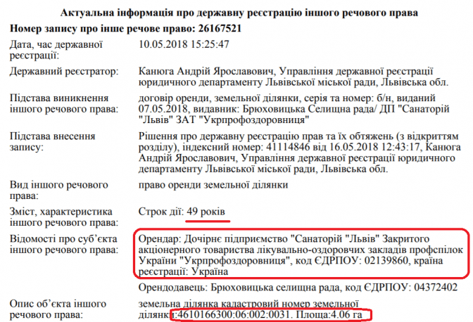 «Земельна ділянка загальною площею 4 га, Місцезнаходження: Львівська область, смт Брюховичі, вул. Курортна, 8. Підписаний договір оренди на 47 років», – йдеться в оголошенні.