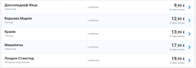 Зі Львова за 10 євро можна полетіти до Дюссельдорфа, за 14 – Кракова та Варшави (аеропорт «Модлін»), за 18 євро до Меммінгена та за 20 євро – до Лондона. Придбати квитки всіма напрямками Ryanair зі Львова можна на сайті авіакомпанії. Квитки можна придбати до 29 липня включно на рейси в осінній період.