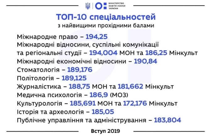 Загалом до ТОП-10 спеціальностей з найвищими прохідними балами потрапили: міжнародне право – 194,25, міжнародні відносини, суспільні комунікації та регіональні студії – 194,004 МОН та 186,25 Мінкульт, міжнародні економічні відносини – 190,84, стоматологія – 189,176, політологія – 189,125, журналістика – 188,75 МОН та 181,662 Мінкульт, медична психологія – 186,9 (МОЗ), культурологія – 185,691 МОН та 172,176 Мінкульт, історія та археологія – 185,05, публічне управління та адміністрування – 183,804.