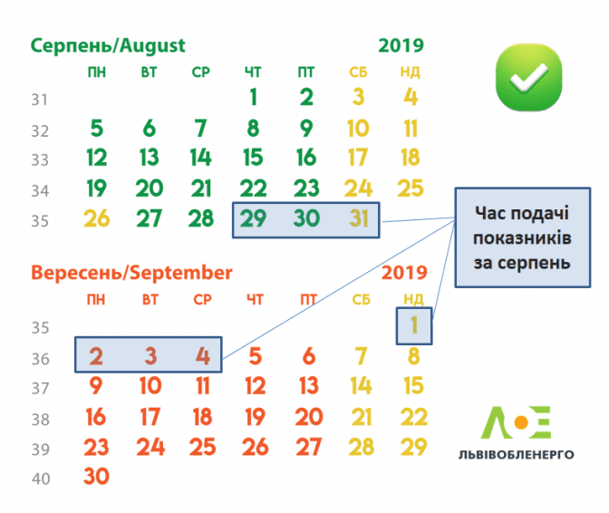 Відтепер подавати покази електролічильника необхідно протягом двох останніх робочих днів або трьох перших робочих днів місяця. Тобто показники електроенергії за серпень 2019 року можна подати з 29 серпня до 4 вересня включно.