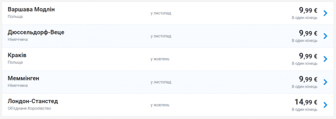 Зі Львова за 10 євро можна полетіти у Краків, Дюссельдорф, Варшаву та Меммінген, а за 15 євро – у Лондон. Придбати квитки можна на сайті авіаперевізника. Розпродаж діятиме до 20 серпня включно.